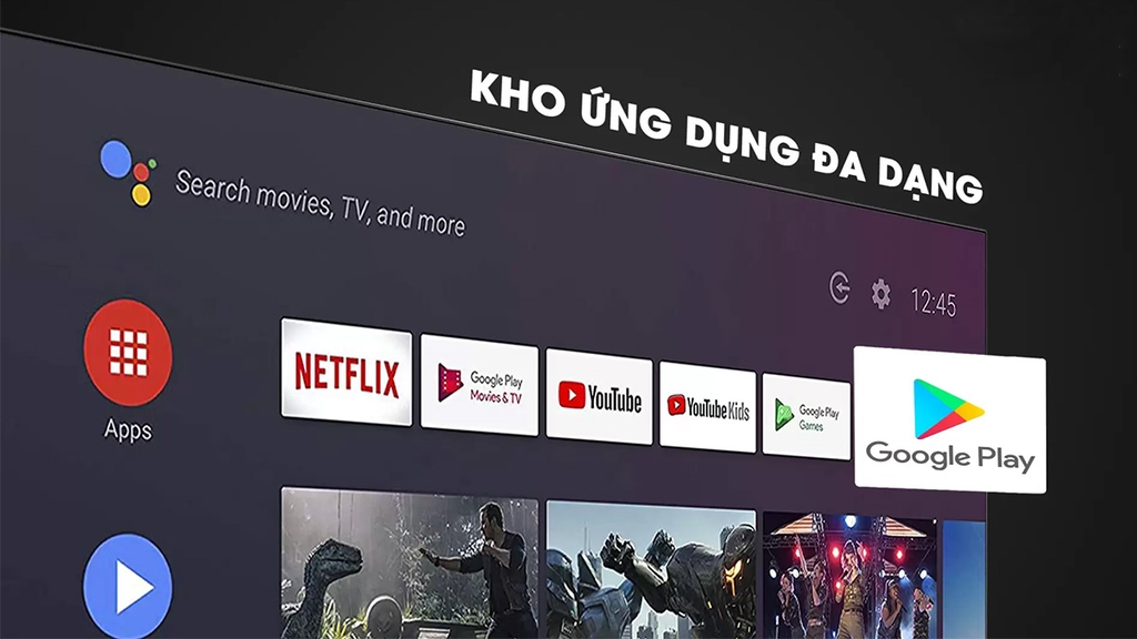 Nhiều ứng dụng trực tuyến được nhiều người sử dụng hiện nay như YouTube, Netflix,... cũng được tích hợp ngay trên trang chủ màn hình để người dùng có thể truy cập ngay lập tức sau khi mở tivi. Đồng thời, với Google Play Store, người dùng có thể thỏa sức tải về tivi các app yêu thích để phục vụ cho nhu cầu làm việc, học tập, giải trí, quản lý cuộc sống,... của mình.