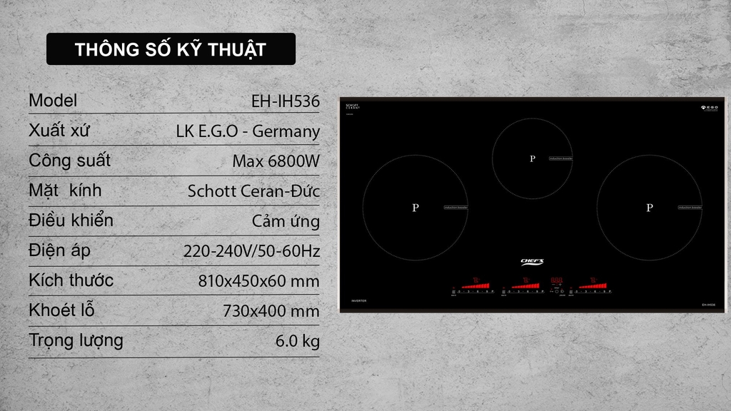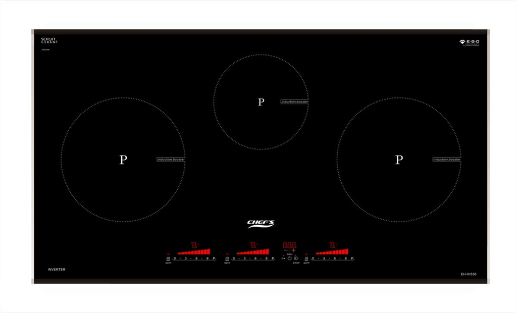 - Bếp từ Chef's EH-IH536 với 3 vùng nấu sử dụng linh kiện nhập khẩu trực tiếp từ hãng E.G.O - Made in Germany. Bếp được lắp ráp tại Việt Nam. Tổng công suất đạt 6800W, tiết kiệm thời gian nấu nướng. Phù hợp với tất cả mọi gia đình.