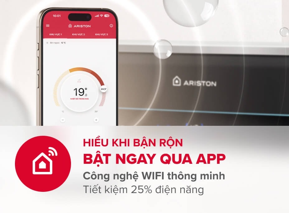 Ariston tự hòa là thương hiệu tiên phong mang công nghệ WIFI thông minh đến cho người tiêu dùng. Thông qua ứng dụng Aqua Ariston NET, bạn có thể kiểm soát bình nước nóng của mình vô cùng dễ dàng, chỉ một chạm đến mọi tính năng: