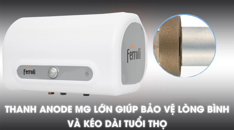 Mg anode có tác dụng làm mềm nước, bảo vệ ruột bình và cho chất lượng nước tốt hơn. Các chuyên gia của Ferroli đã nghiên cứu và phát triển thanh anode Mg với kích thước lớn hơn giúp gia tăng thời gian bị ăn mòn và kéo dài tuổi thọ cho bình chứa