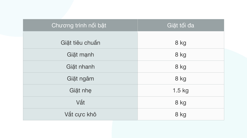 | Khối lượng giặt | 8 kg |