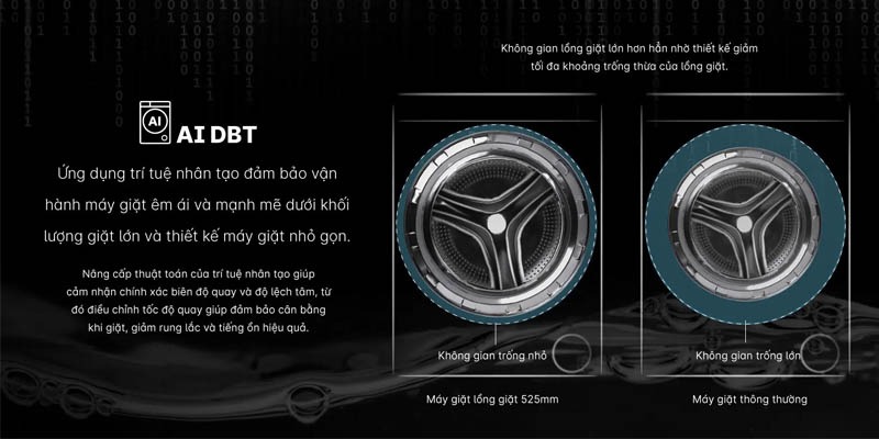 - Công nghệ cân bằng AI DBT: Tự động cân chỉnh biên độ quay và độ lệch tâm của lồng giặt, để điều chỉnh tốc độ quay và giảm thiểu tiếng ồn phát ra từ độ rung lắc của máy giặt khi hoạt động mà không làm giảm đến hiệu quả giặt sạch quần áo.