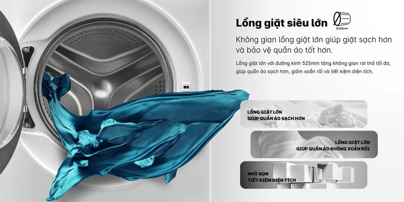 - Lồng giặt lớn với đường kính lên đến 525mm, tăng không gian rơi thả tối đa, đáp ứng nhu cầu giặt giũ lên đến 12kg, phù hợp cho gia đình có từ 6 đến 8 thành viên hay có nhu cầu giặt giũ nhiều.