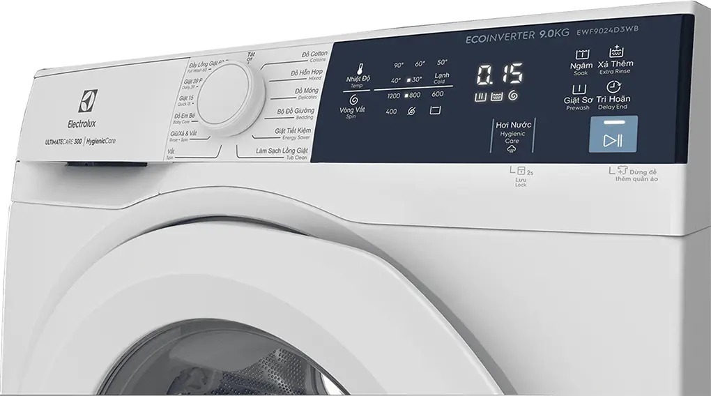 - Máy Giặt Inverter Electrolux 9 Kg EWF9024D3WB mang kiểu dáng cửa trước hiện đại, đi cùng sắc trắng trung tính, tinh tế và thiết kế bảng điều khiển song ngữ tiếng Anh/Việt sẽ nâng cao vẻ đẹp sang trọng, thanh lịch cho không gian nội thất nhà bạn.
