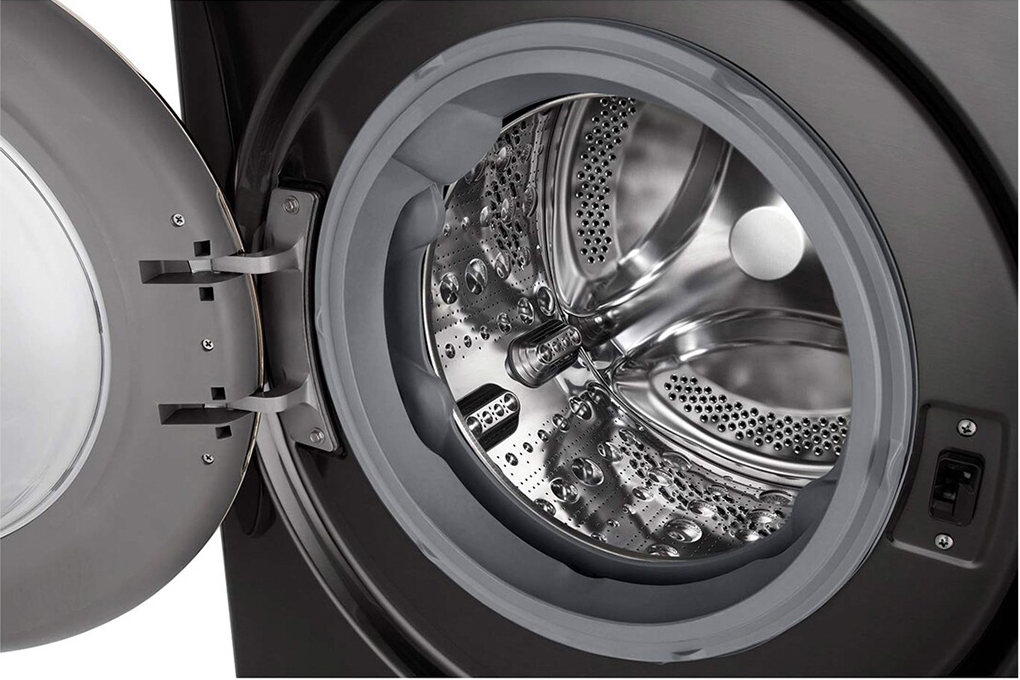 - Lồng giặt làm bằng thép không gỉ cứng cáp, bóng sáng, hạn chế gỉ sét, ít bám bẩn, hỗ trợ bạn vệ sinh dễ dàng. Bên cạnh lồng giặt có cần nâng thép không gỉ giúp tăng hiệu suất giặt, chống lại vi khuẩn đến 99%.