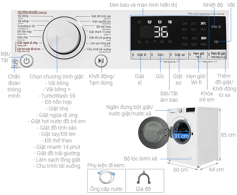| Chương trình giặt | Chu trình đặc biệt TurboWash 59 Vải bông Vải bông + Giặt chăn ga Giặt hơi nước đồ trẻ em Giặt ngừa dị ứng Giặt nhanh 14 phút Giặt nhẹ Giặt tay + đồ len Vệ sinh lồng giặt Đồ hỗn hợp Đồ thể thao Đồ tinh xảo |