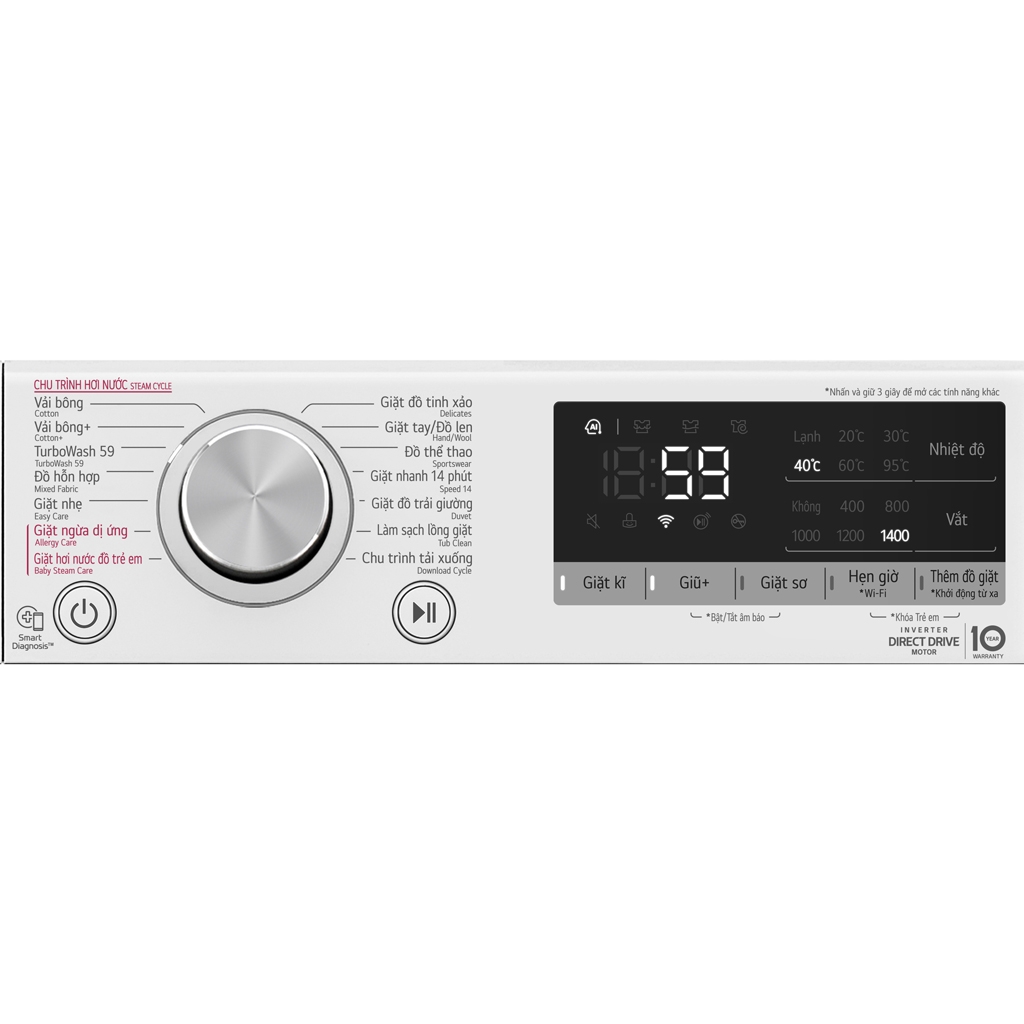 Chẩn đoán lỗi Smart Diagnosis Hẹn giờ giặt Khóa trẻ em Thêm đồ trong khi giặt Cho phép điều khiển máy giặt từ xa qua ứng dụng LG ThinQ Giặt hơi nước |