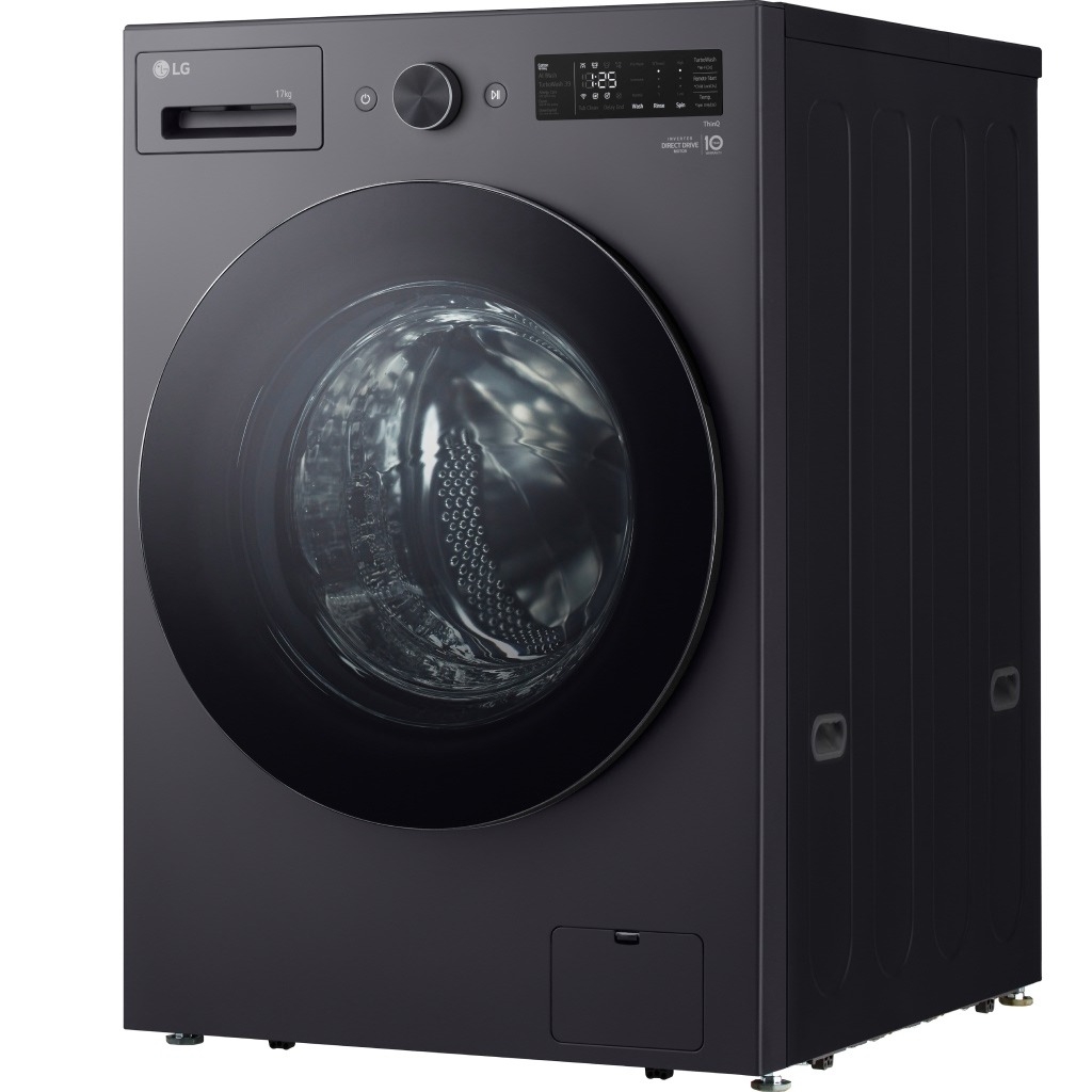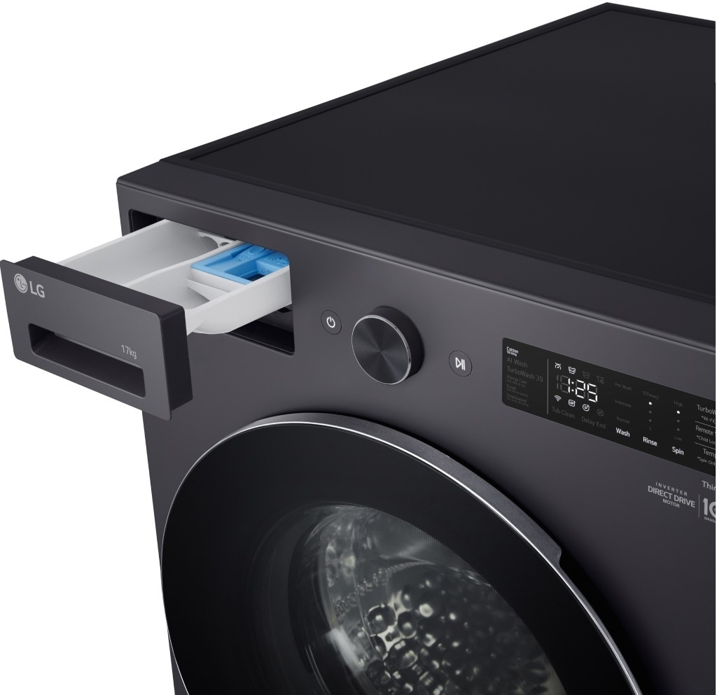 - Máy giặt LG lồng ngang AI DD Inverter 17Kg F2517SNTG với thiết kế cửa ngang hiện đại, chắc chắn và máy có tông màu đen sang trọng, tạo điểm nhấn cho không gian phòng giặt nhà bạn.