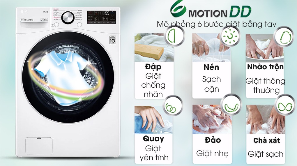 Công nghệ giặt của máy F2515STGW 6 chuyển động được mô phỏng như bàn tay để thực hiện các thao tác như: đập, nhào trộn, nén, đảo, quay và chà xát, giúp vết bẩn trên quần áo được loại bỏ dễ dàng. Hơn nữa, công nghệ này còn góp phần bảo vệ sợi vải tối ưu và giảm tình trạng xoắn rối sau khi giặt.