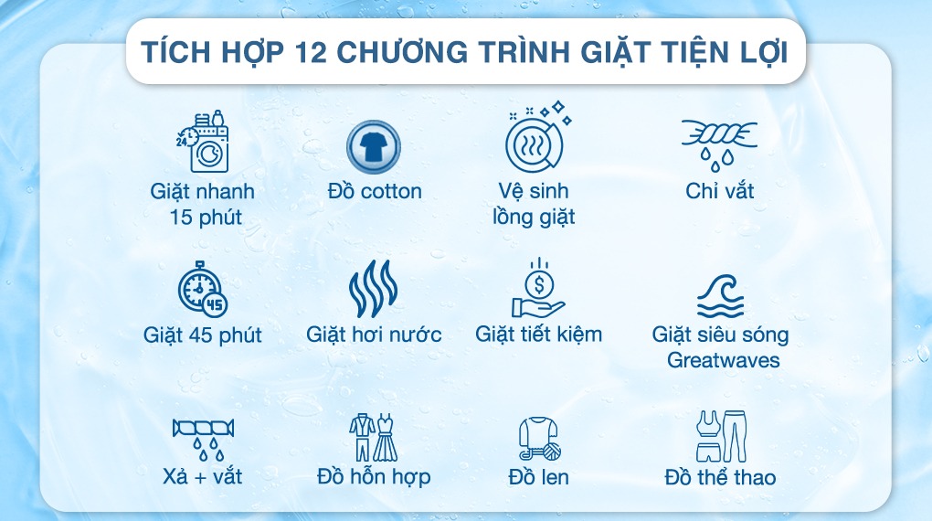 | Chương trình giặt | Đồ thể thao Chỉ vắt Đồ len Đồ hỗn hợp Đồ cotton Xả + vắt Vệ sinh lồng giặt Giặt tiết kiệm Giặt siêu sóng Greatwaves Giặt nhanh 15 phút Giặt hơi nước Giặt 45 phút |