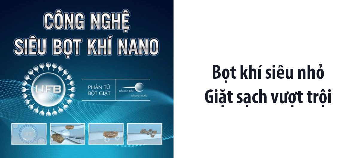 - Công nghệ siêu bọt khí Nano (UFB - Ultra Fine Bubble) được trang bị trên máy giặt Toshiba giúp tạo ra các bọt khí có kích thước Nano siêu nhỏ chỉ bằng 1/200 khe hở sợi vải. Các siêu bọt khí sẽ thấm sâu, đưa phân tử xà phòng vào sâu từng sợi vải, đánh bay những vết bẩn cứng đầu nhất.