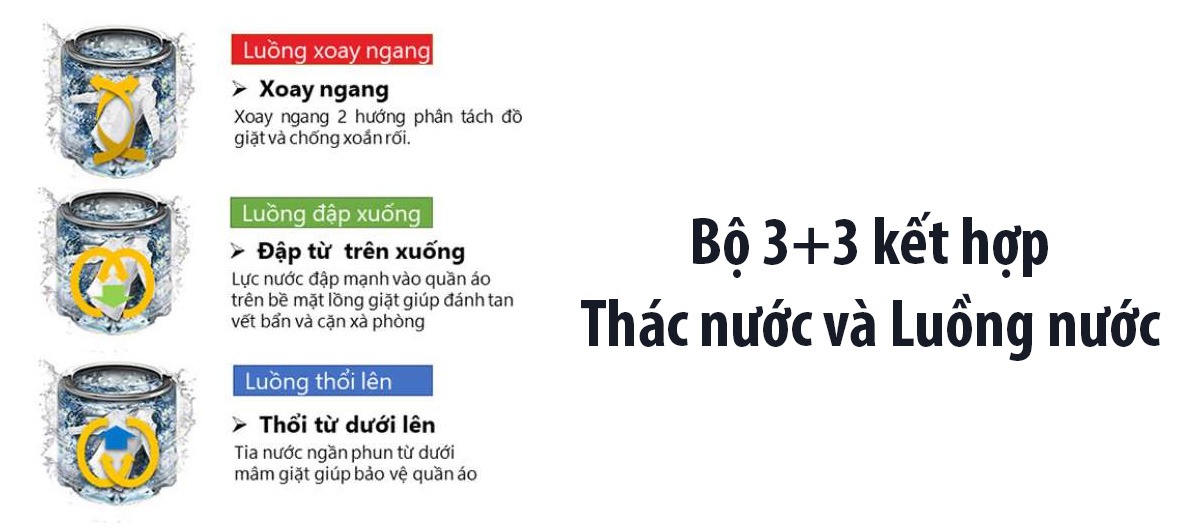 - Luồng nước xoay ngang: Xoay ngang hai hướng, phân tách đồ giặt và chống xoắn rối.