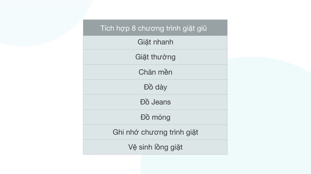 | Chương trình giặt | Đồ mỏng Đồ Jeans Đồ dày Vệ sinh lồng giặt Giặt thường Giặt nhanh Ghi nhớ chương trình giặt Chăn mền |