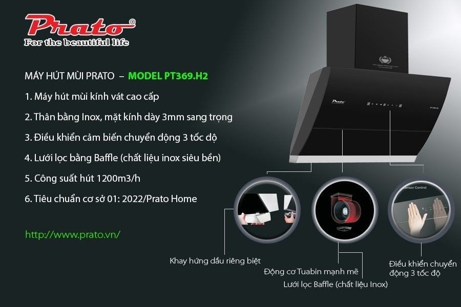 - Máy hút mùi Prato PT-369.H2 là dòng sản phẩm tiên tiến đến từ Italy có thiết kế cảm ứng 3 tốc độ và hiệu suất mạnh mẽ, đáp ứng mọi nhu cầu hút mùi và làm sạch không khí trong không gian nấu ăn của bạn. Hãy cùng Bếp Thái Sơn trải nghiệm sản phẩm ngay sau đây!