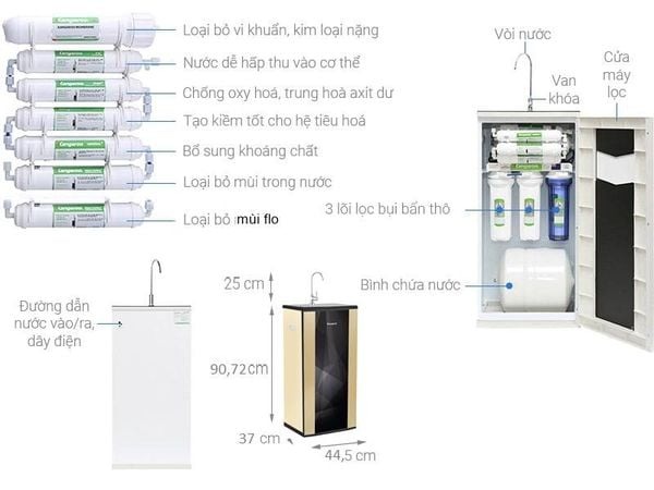 | Lõi lọc chức năng | - Lõi 5: FIR+ (Sx Việt Nam) - Lõi 6: OrpH+ (Sx Việt Nam) - Lõi 7: HypH+ (Sx Việt Nam) - Lõi 8: Mineral+ (Sx Việt Nam) - Lõi 9: 5 in 1+ (Sx Việt Nam) - Lõi 9: Nano Carbon+ (Sx Việt Nam) |