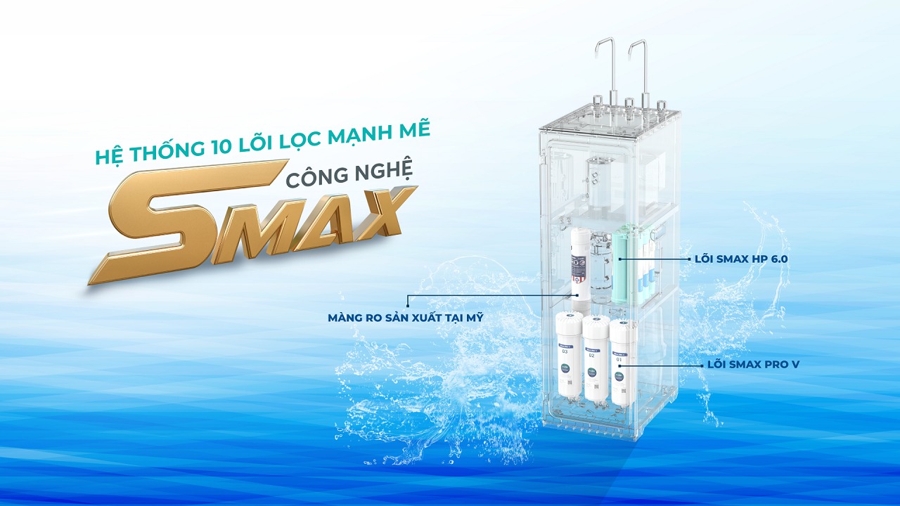 - Cụm Smax Pro V 1, 2, 3: Công nghệ smart connect chống hàng giả hàng nhái, hoạt động ổn đinh gấp đôi, bảo vệ hiệu quả hệ thống lọc. Tăng 2 lần hiệu quả lọc, giúp loại bỏ cặn bẩn có kích thước siêu nhỏ từ 1 micromet, chất hữu cơ và mùi khó chịu của nước; tăng gấp đôi tuổi thọ của lõi.