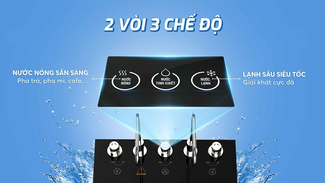 2 vòi độc lập cùng 3 chế độ nước nóng - lạnh - tinh khiết luôn sàng cho mọi nhu cầu của cả gia đình