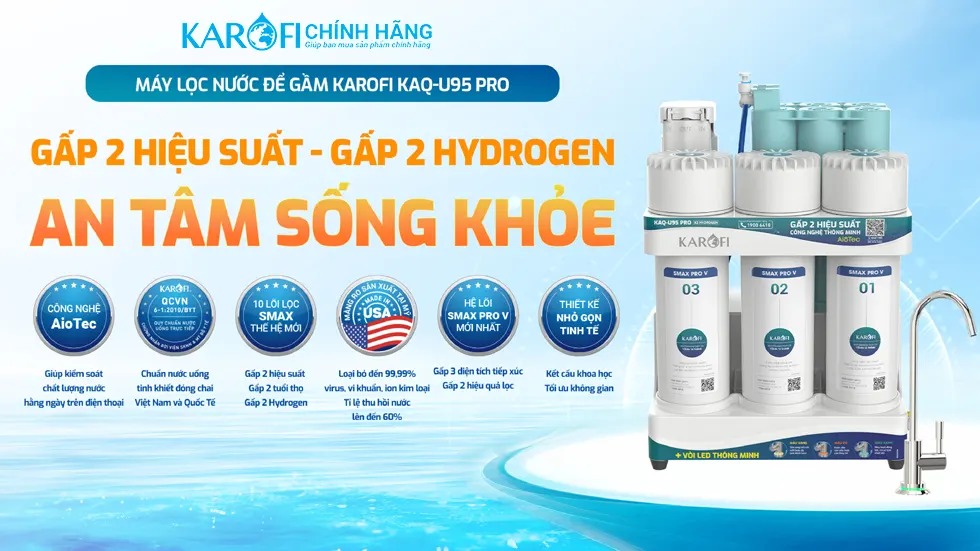 - Sở hữu Máy lọc nước Karofi KAQ-U95 Pro trong tay sẽ giúp bạn giải quyết toàn bộ vấn đề về nguồn nước, lọc sạch mọi cặn bẩn, vi khuẩn, virus... nước sau lọc của KAQ-U95 Pro còn được bổ sung gấp 2 lần Hydrogen chống oxy hoa hiệu quả. Đặc biệt, tích hợp công nghệ thông minh AioTec giám sát chất lượng nước từ xa giúp cả gia đình bạn an tâm sống khỏe.