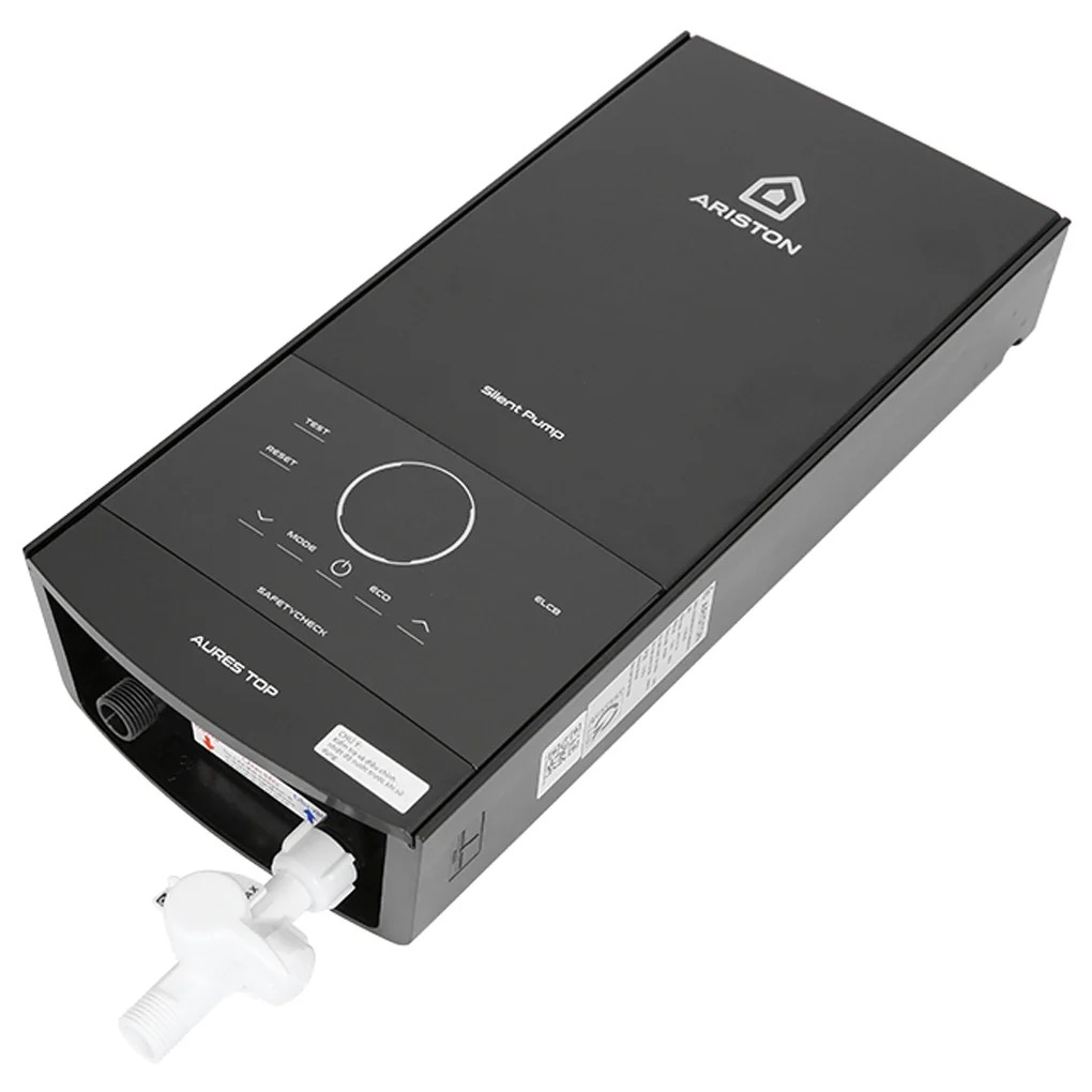 - Máy nước nóng Ariston 4500W AURES TOP 4.5P có kiểu dáng hình chữ nhật đứng, thiết kế hiện đại với sắc đen sang trọng.