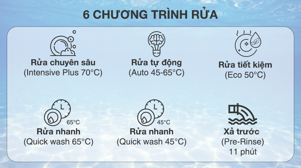 6 chương trình rửa tiện lợi, bao gồm: Intensive Plus 70°C (rửa chuyên sâu 70°C), Auto 45-65°C (rửa tự động 45-65°C), Eco 50°C (rửa tiết kiệm 50°C), Quick wash 65°C (rửa nhanh 65°C), Quick wash 45°C (rửa nhanh 45°C), Favourite (chế độ rửa yêu thích).