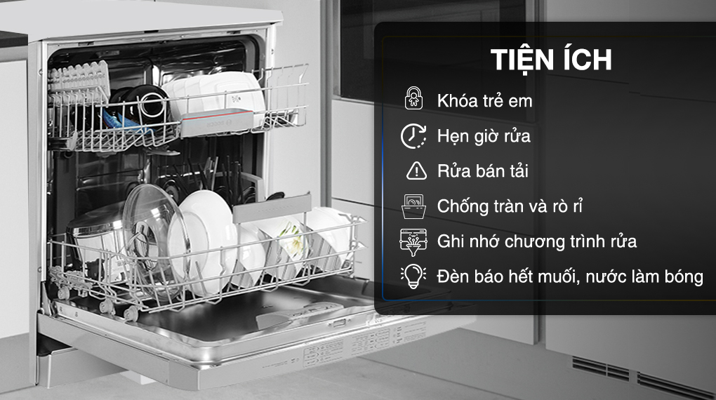 - Máy rửa chén Bosch hoạt động với công suất 2400W, có thể rửa được 3 - 4 bữa ăn Việt (tương đương với 12 bộ châu Âu).