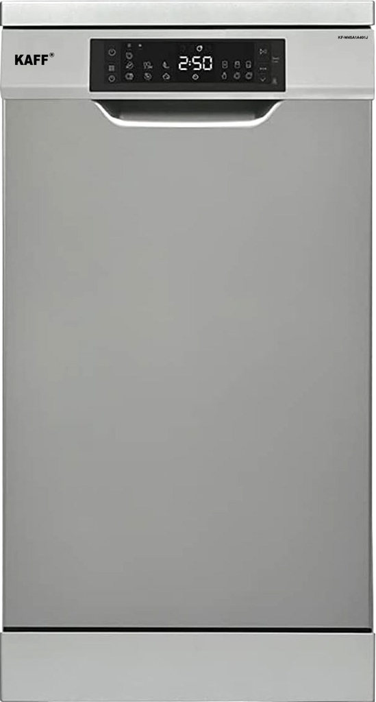 - Máy rửa bát 10 bộ Kaff KF-W45A1A401J có thiết kế hình chữ nhật dọc, có kích thước R448 x S598 x C(820-850) mm. Nhìn bề ngoài, máy có hình dạng như một chiếc tủ lạnh mini, khá nhỏ gọn và tiện ích, dễ dàng di chuyển tới nhiều vị trí khác nhau trong căn bếp gia đình.