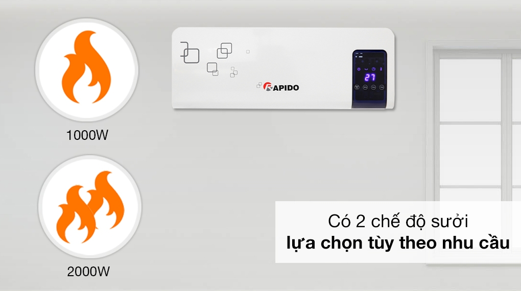 Quạt sưởi có 2 chế độ sưởi tương ứng với 2 mức công suất là 1000W - 2000W
