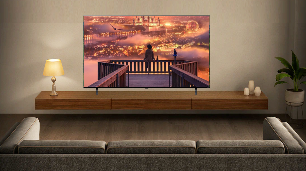 - Chân đế tivi hình chữ V úp ngược chắc chắn, bố trí kiểu để bàn vững vàng. Bạn cũng có thể lắp tivi treo tường giúp không gian nội thất thông thoáng, rộng rãi hơn.