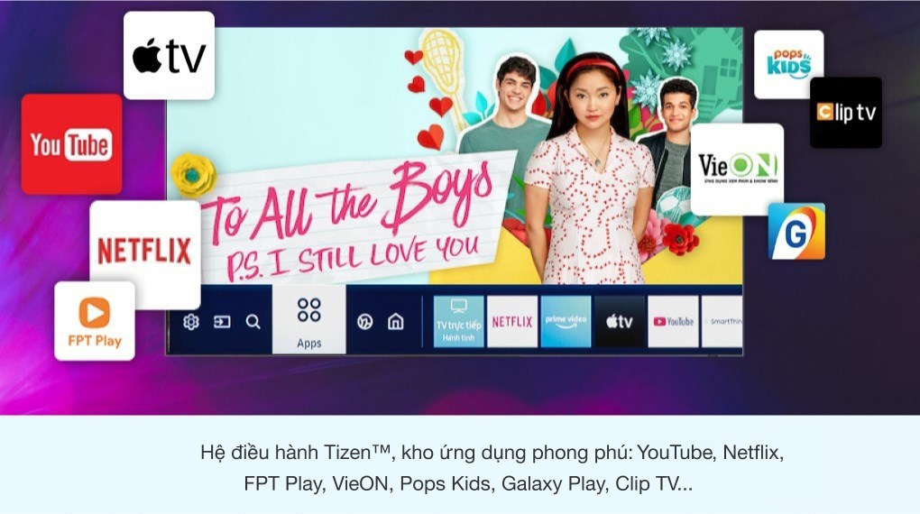 Với thiết kế giao diện trực quan, dễ dùng và rất thân thiện với các thành viên trong gia đình. Đặc biệt, kho ứng dụng vô cùng phong phú như: Spotify, FPT Play, Galaxy Play, VTVCab ON, ClipTV, MyTV, POPS Kids,... có thể đáp ứng được các nhu cầu giải trí của các thành viên trong gia đình, từ người già đến trẻ nhỏ với hệ điều hành Tizen™ trên chiếc Smart tivi Samsung này.