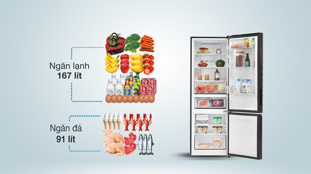 | Dung tích sử dụng | 317 lít(Ngăn đá 91 lít, Ngăn lạnh 167 lít, Chuyển đổi 34 lít) |