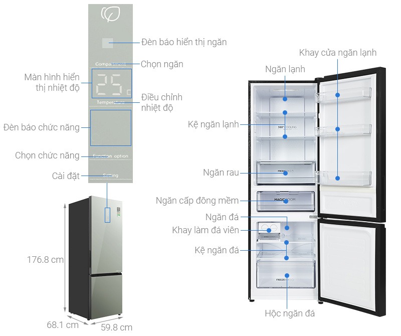 | Tiện ích | Làm đông nhanh Làm lạnh nhanh Hộp đá xoay di động Chức năng thông minh tự điều chỉnh nhiệt độ từng ngăn Bảng điều khiển cảm ứng bên ngoài cửa tủ Chế độ kỳ nghỉ |