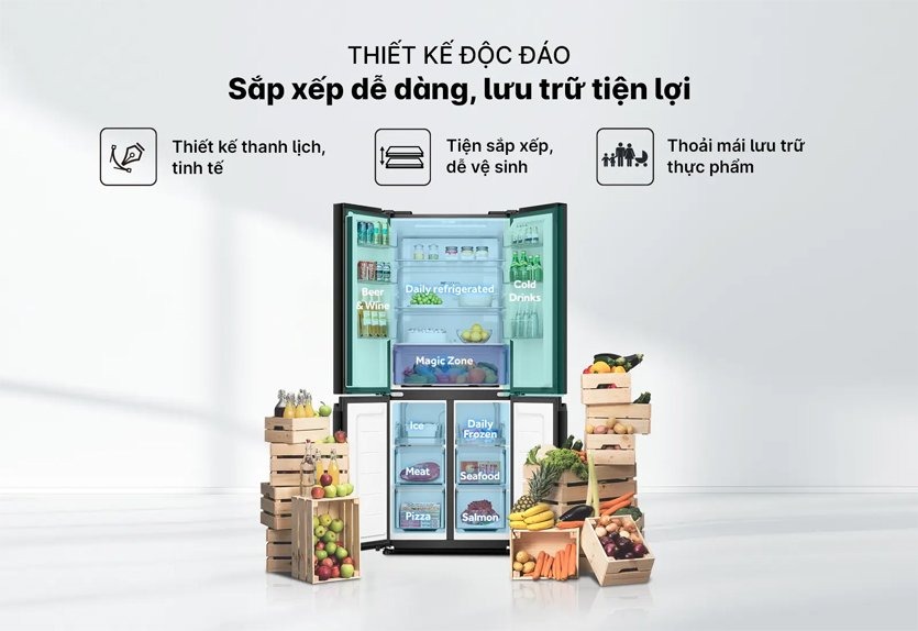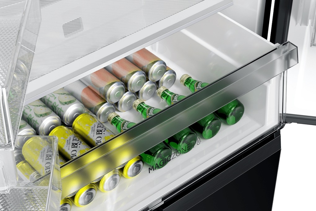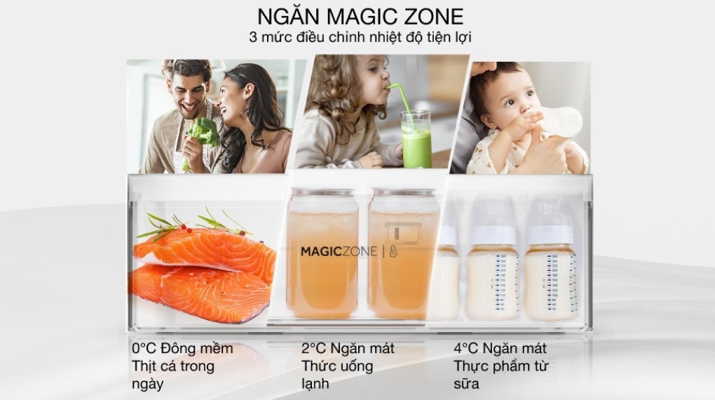 - Ngăn Magic Zone với 3 mức điều chỉnh nhiệt độ linh hoạt phục vụ đa dạng các nhu cầu lưu trữ, từ thực phẩm tươi sống, đồ uống cho đến rau củ và trái cây.