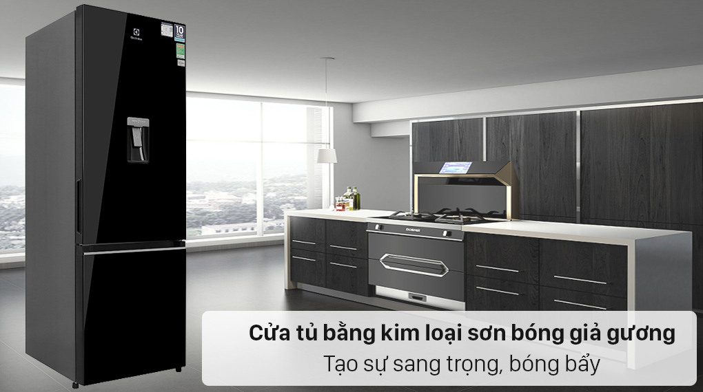 - Electrolux Inverter EBB3742K-H thuộc kiểu ngăn đá dưới tiện lợi cho những người có thói quen sử dụng ngăn lạnh thường xuyên mà không cần phải khom lưng nhiều. Hơn nữa, chất liệu cửa tủ làm bằng kim loại phủ sơn bóng giả gương rất sang trọng, trở thành điểm nhấn trong không gian nhà bếp hiện đại.