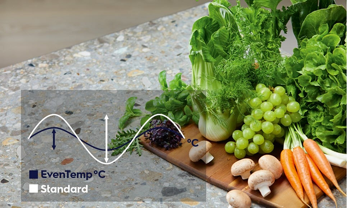 Tủ lạnh trang bị hệ thống làm lạnh EvenTemp giữ cho thực phẩm tươi ngon lâu hơn nhờ giảm sự dao động về nhiệt độ. Cụ thể, công nghệ này sẽ làm lạnh từng ngăn riêng biệt, nhiệt độ sẽ được duy trì ổn định trong toàn bộ khoang tủ, lưu giữ hương vị và cấu trúc thực phẩm lâu hơn.