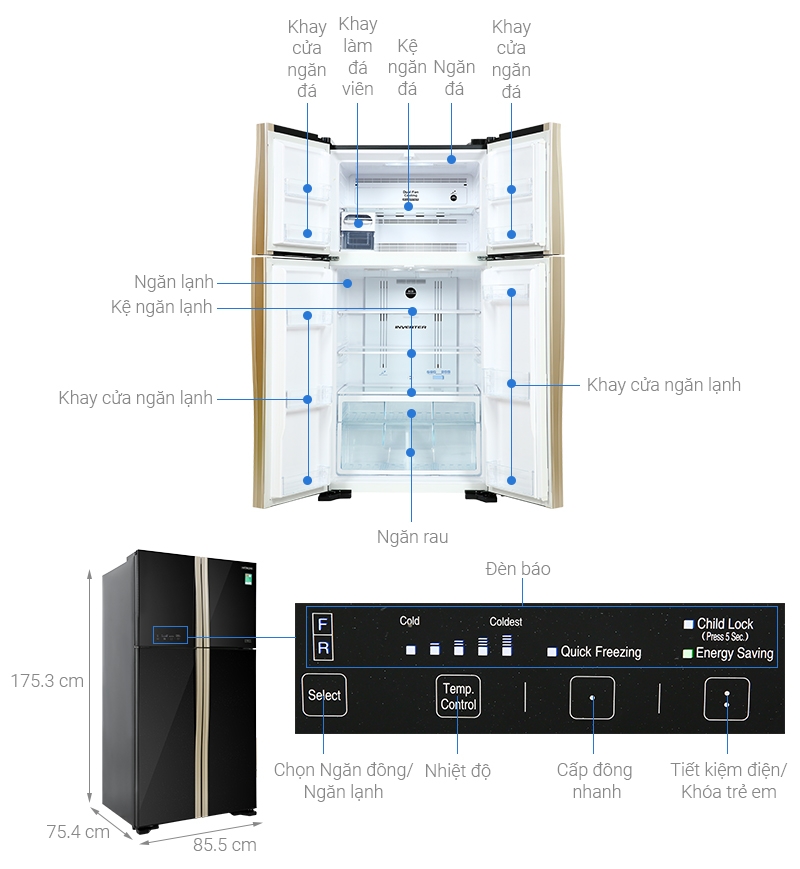 | Tiện ích | - Ngăn trữ chuyển đổi - Chuông báo quên đóng cửa - Đệm cửa chống mốc - Đèn LED chiếu sáng - Chế độ cấp đông nhanh - Khay thủy tinh chịu lực - Khay đá lớn xoay, có thể tháo rời - Khoá trẻ em |