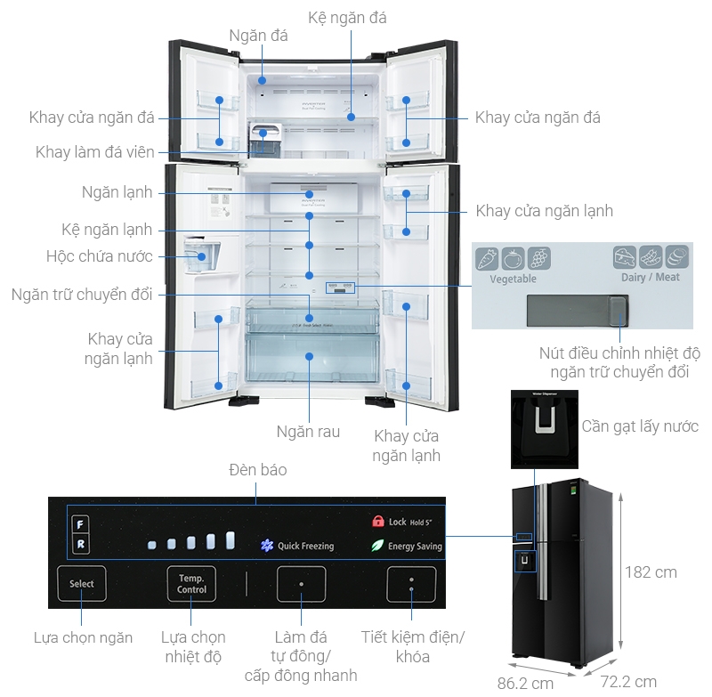 | Tiện ích | - Lấy nước bên ngoài - Chuông báo quên đóng cửa - Đệm cửa chống mốc - Đèn LED chiếu sáng - Chế độ cấp đông nhanh - Khay thủy tinh chịu lực - Khay đá lớn xoay, có thể tháo rời - Khoá trẻ em |