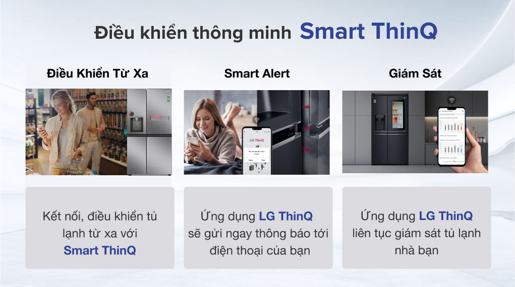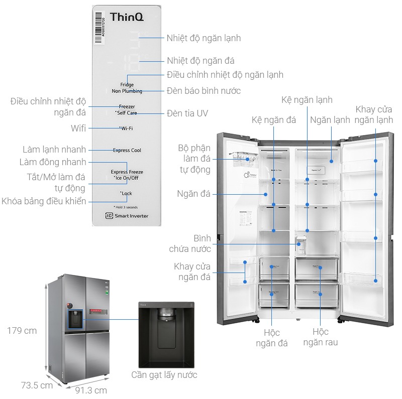 | Tiện ích | Có khóa trẻ em Làm lạnh nhanh Tích hợp WIFI - Smart ThinQ™ Lấy đá bên ngoài Làm đông nhanh Lấy nước ngoài Làm đá tự động |