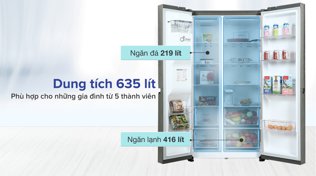 - Dung tích sử dụng lên đến 635 lít, thích hợp với nhu cầu sử dụng cho gia đình có từ 5 người.