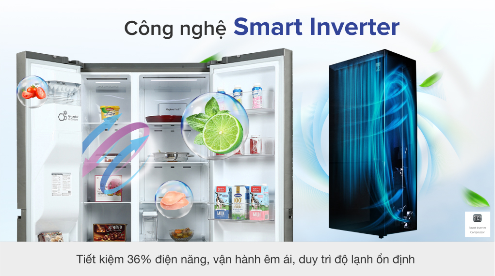 - Công nghệ Smart Inverter giúp tiết kiệm điện 36% điện năng, ngoài ra tủ lạnh sẽ hoạt động êm ái với độ bền cao.