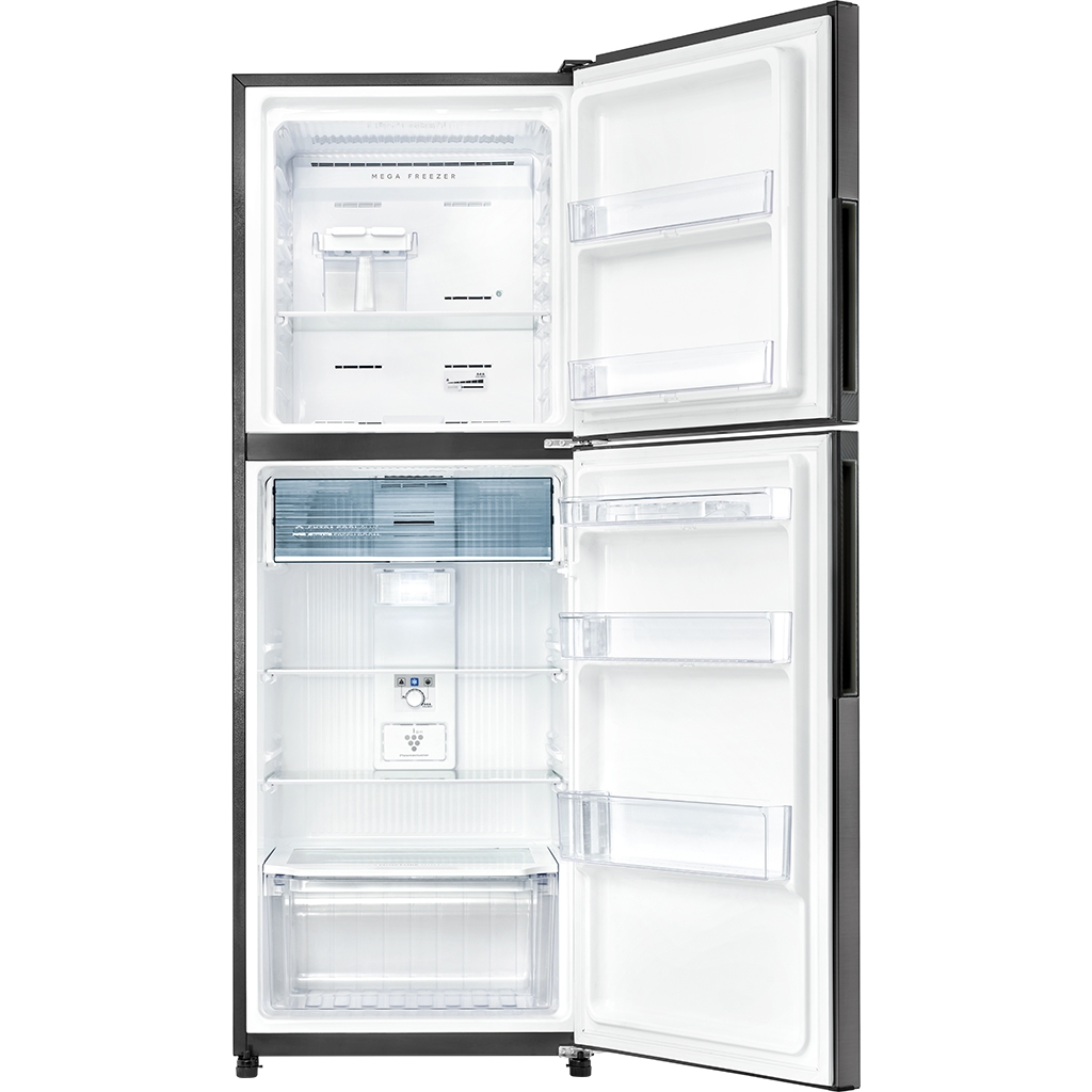- Sharp SJ-X252AE-SL thuộc kiểu tủ lạnh ngăn đá trên có 2 cánh cửa bằng thép không gỉ bóng sáng, hạn chế rỉ sét, sử dụng bền bỉ và dễ dàng làm sạch.