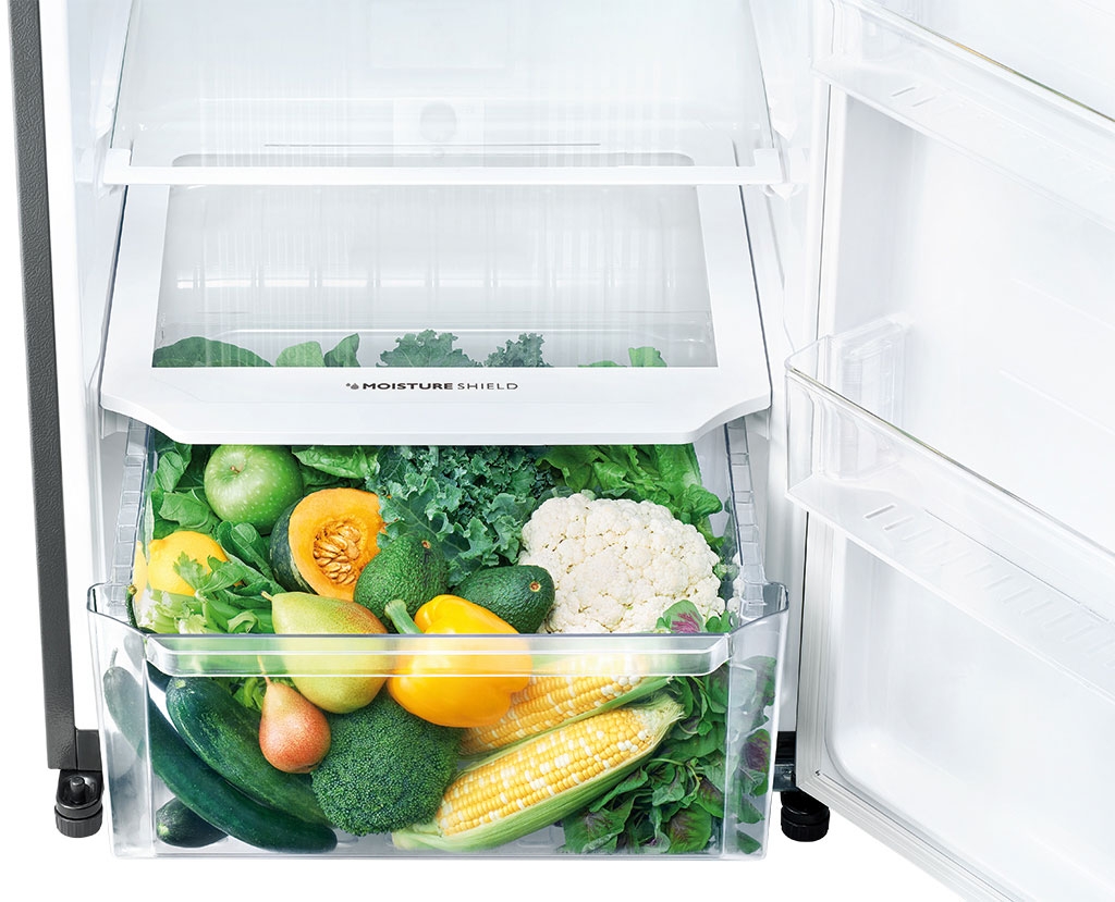 - Được trang bị các kệ bằng kính chịu lực có độ bền cao để tăng không gian sắp xếp thực phẩm. Phần cánh cửa tủ cũng có các khay kệ để người dùng có thể đặt để các loại chai lọ tiện lợi. Đặc biệt là có ngăn rau để bảo quản các loại thực phẩm cần độ ẩm cao như rau củ, trái cây.