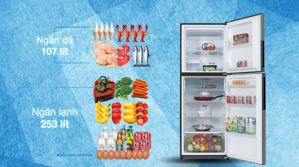 - Tủ có thiết kế ngăn đông phía trên có dung tích 107 lít khá thoải mái để người dùng lưu trữ những thực phẩm dài ngày. Phía dưới là ngăn mát có dung tích là 253 lít được chia thành nhiều ngăn giúp người dùng tối ưu không gian lưu trữ thực phẩm.