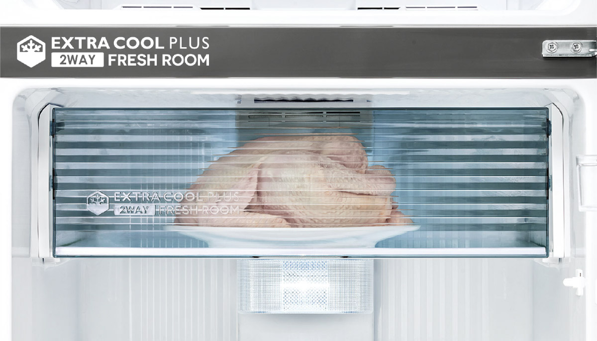 - Bên cạnh đó, người dùng còn có thể bảo quản thực phẩm tươi sống trong ngăn Extra Cool Plus. Ngăn này sẽ được duy trì ở nhiệt độ - 2 độ C giúp thực phẩm vẫn giữ được độ tươi ngon nhưng không làm đông đá. Chính vì vậy người dùng có thể lấy thực phẩm từ ngăn này ra và chế biến ngay không phải mất công chờ đợi rã đông.