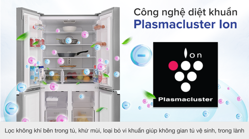 - Tủ lạnh Sharp Inverter 401 lít SJ-FXP480V-SL được trang bị công nghệ Plasmacluster ion diệt khuẩn và khả năng khử nhờ vào bộ lọc các phân tử Ag+Cu giúp diệt vi khuẩn, nấm mốc, virus và mùi hôi khó chịu thông qua quá trình oxi hóa các ion.