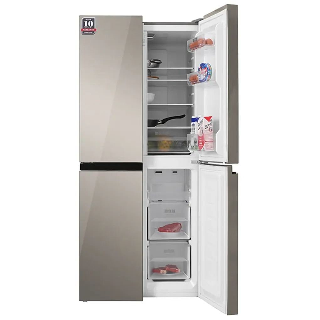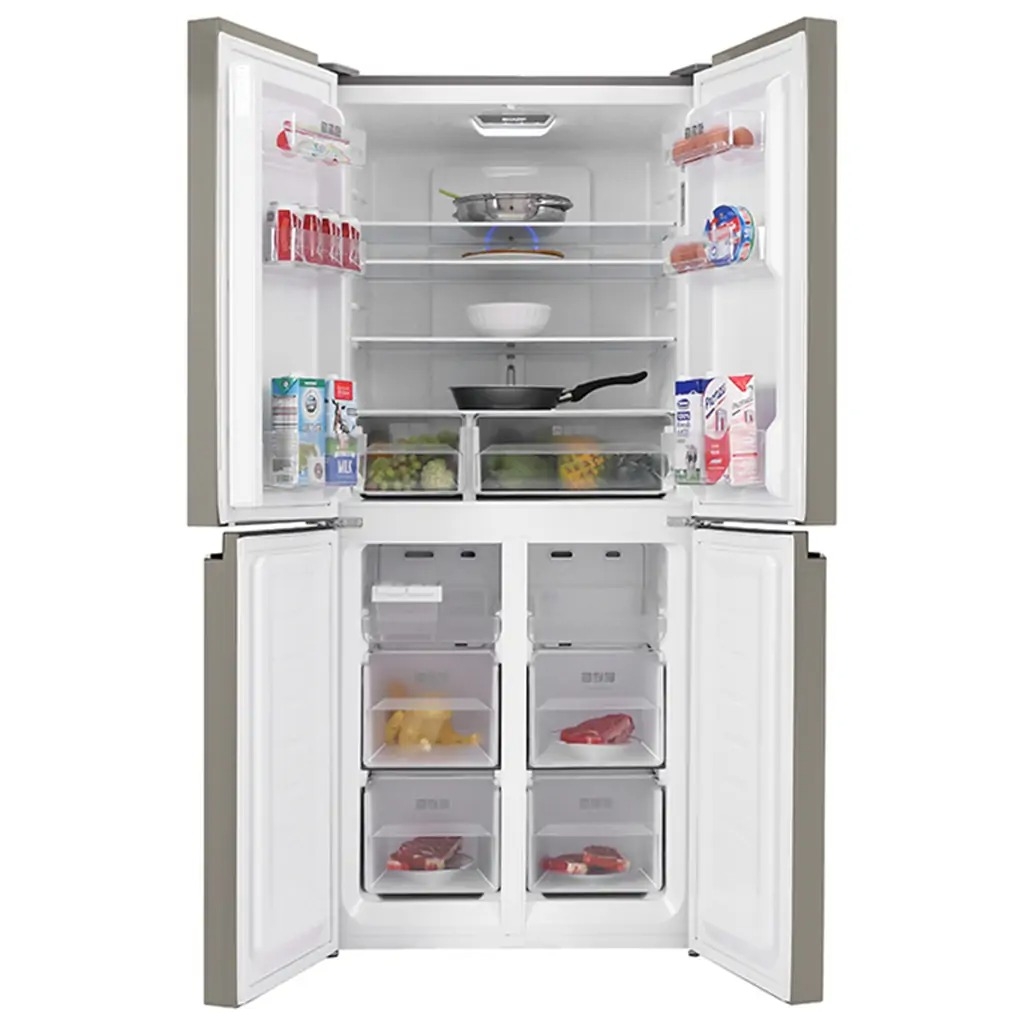 - Chiếc tủ lạnh 4 cửa này thiết kế theo phong cách của Pháp mang lại không gian chứa thực phẩm rộng rãi. Tủ lạnh Sharp dung tích lớn nhưng không mang lại cảm giác cồng kềnh, trái lại nó còn cực kỳ sang trọng thời thượng nhờ vào chất liệu cửa tủ là kim loại phủ sơn tĩnh điện cùng với thiết kế của dòng tủ lạnh mặt gương sang trọng.