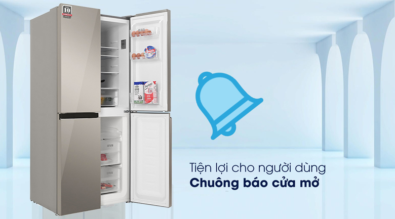 - Ngoài ra, tủ lạnh còn trang bị thêm chuông báo mở cửa, chuông này sẽ reo khi bạn mở cửa quá lâu hay không đóng kín cửa giúp tránh thất thoát hơi lạnh ảnh hưởng đến thực phẩm và tiết kiệm điện năng.