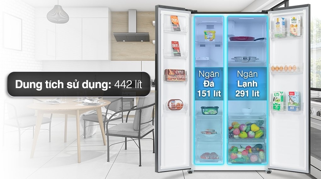 - Tủ lạnh Sharp đáp ứng tốt cho nhu cầu bảo quản thực phẩm của các hộ gia đình từ 4 - 5 người nhờ thiết kế dung tích sử dụng 442 lít.
