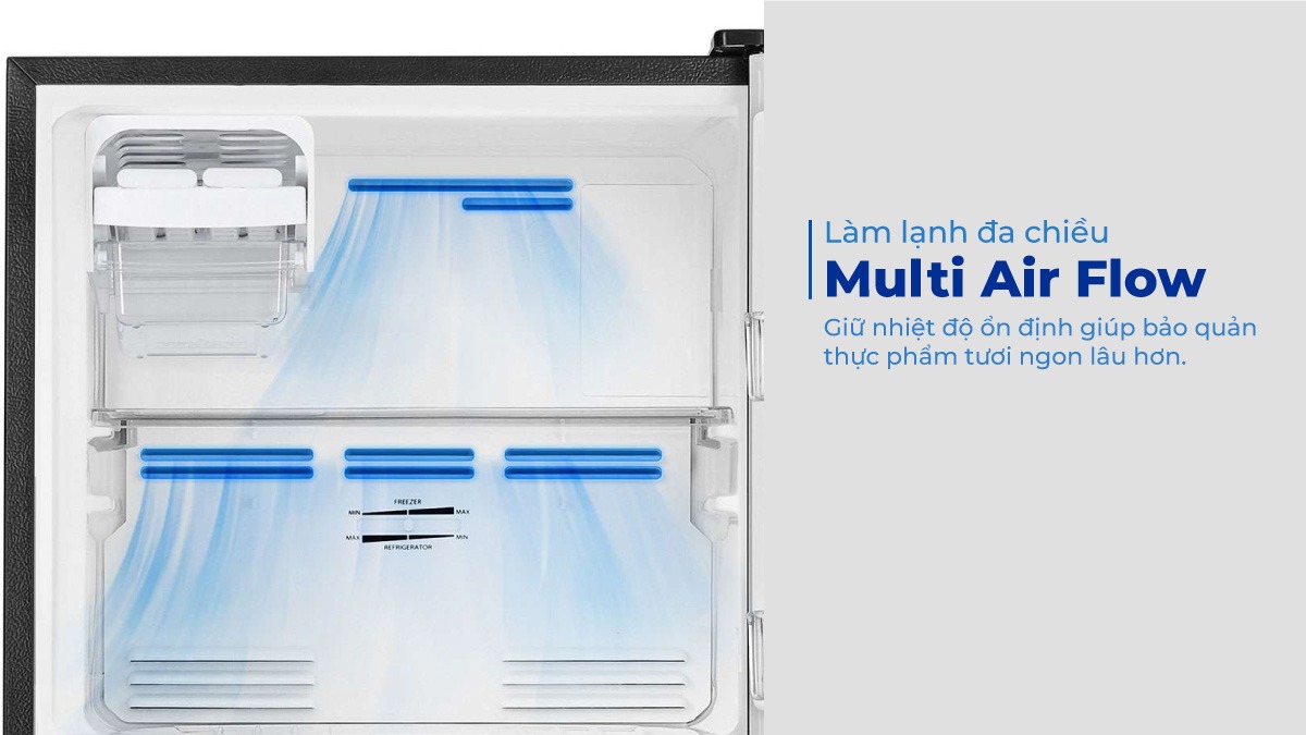 - Công nghệ Multi Air Flow: Khí lạnh được tỏa ra vừa đủ để phân bổ đến mọi vị trí bên trong giữa các ngăn tủ. Nhờ đó kéo dài thời gian bảo quản thực phẩm lâu hơn cũng như hạn chế tình trạng hơi lạnh không được tỏa đồng đều giữa các ngăn.