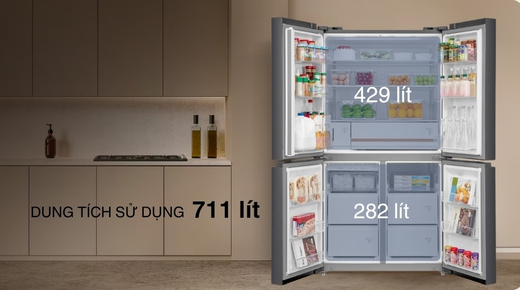 - Dung tích 429 lít được chia thành các khay linh hoạt, phù hợp để bảo quản từ rau củ, đồ ăn sẵn đến chai lọ cao.