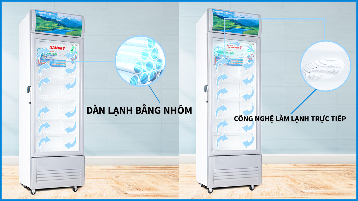 Công nghệ làm lạnh trực tiếp trong tủ mát Sanaky VH-408K3L là hệ thống đưa hơi lạnh trực tiếp tới ngăn tủ thông qua đối lưu gió, giúp làm lạnh trực tiếp thực phẩm một cách hiệu quả. Dàn lạnh của tủ được làm bằng nhôm, mang lại hiệu suất truyền nhiệt tốt và đẩy nhanh tốc độ làm lạnh.